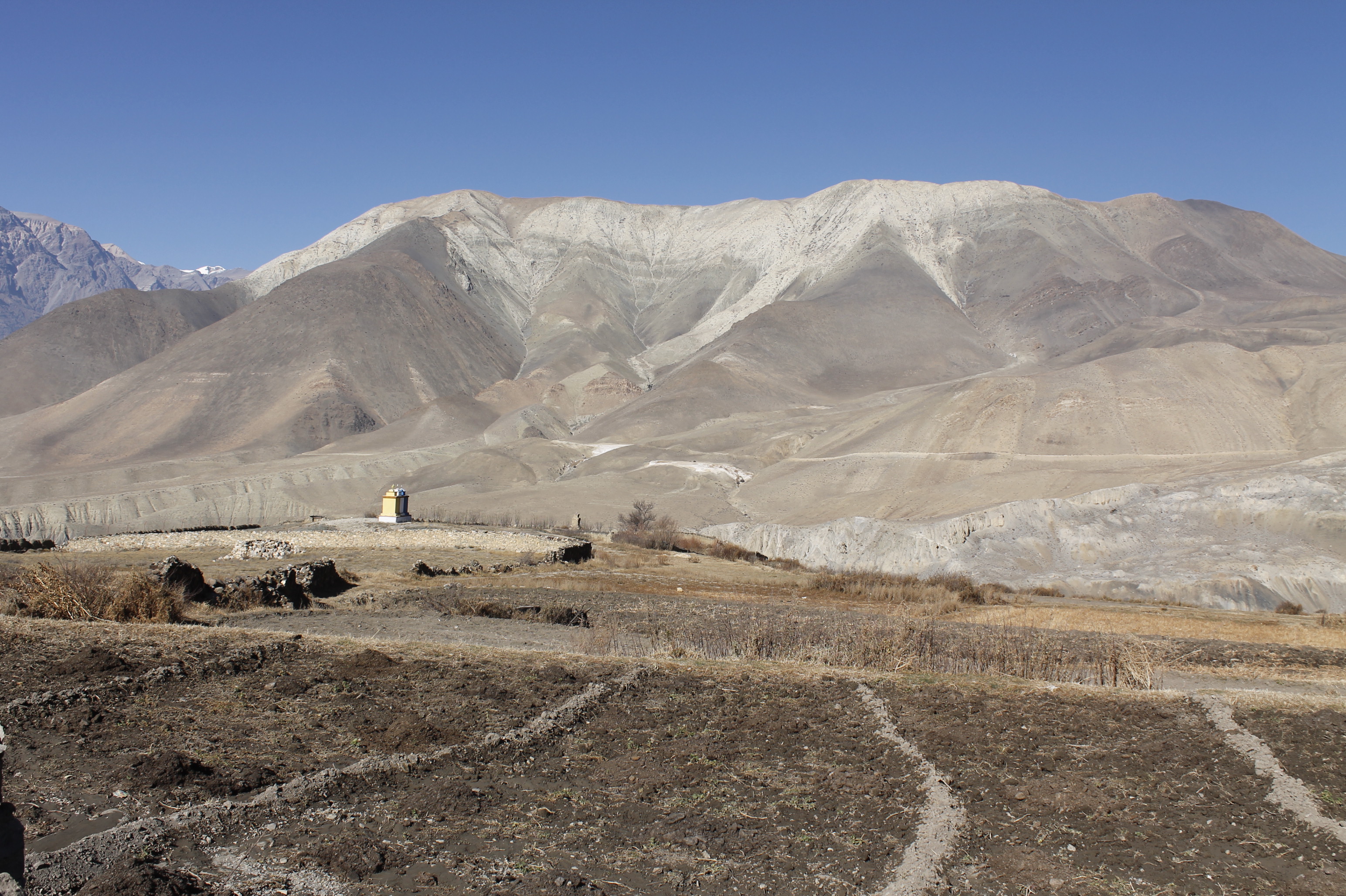 The wide valley in which Kagbeni is situated is not carved by the Kali Gandaki River that runs through it as many people assume. Instead, it is a block of land that has moved downwards over the years, and the river has followed.